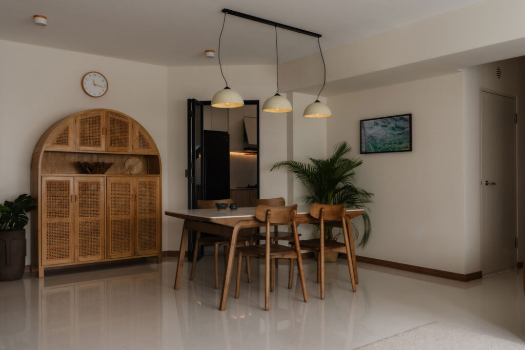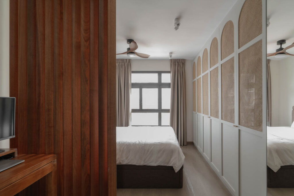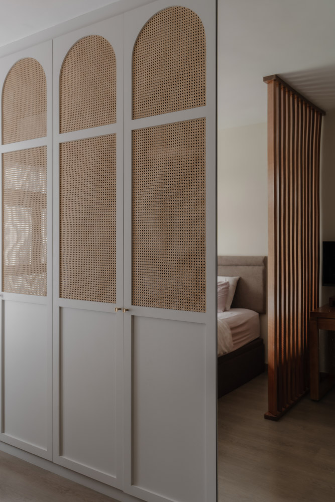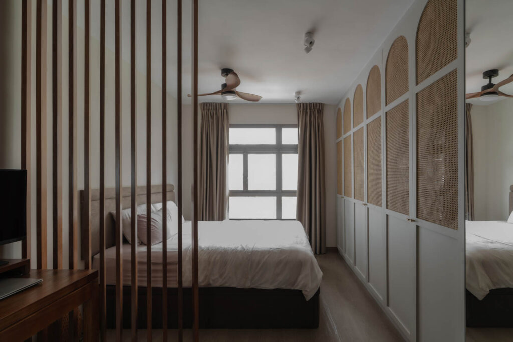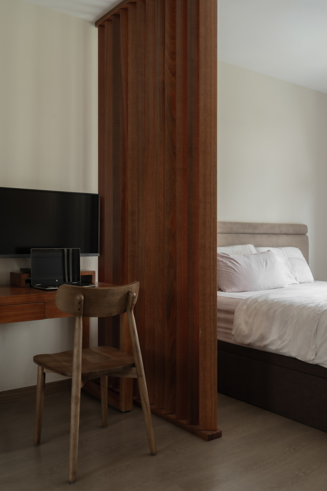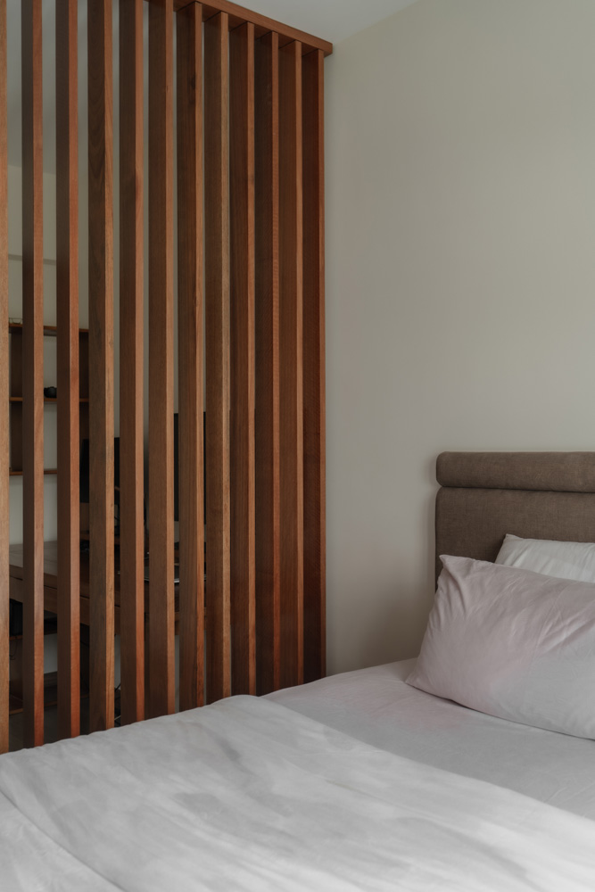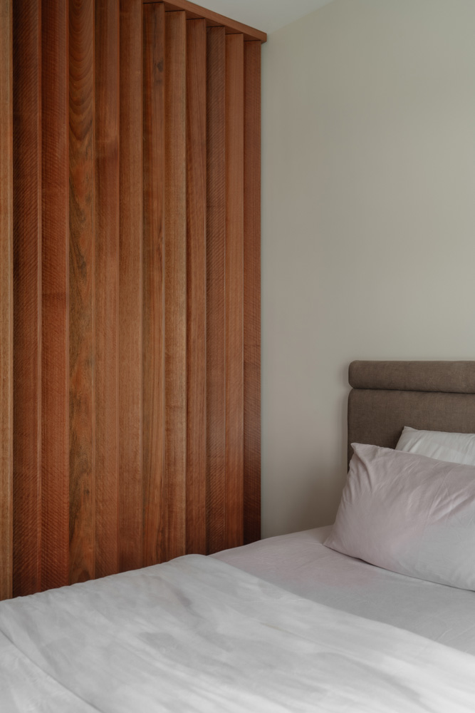 Vertical lines define the home’s visual identity—from a bespoke sliding slatted screen in the living area to a full-height fluted headboard in the master bedroom, both catching light and adding quiet texture.