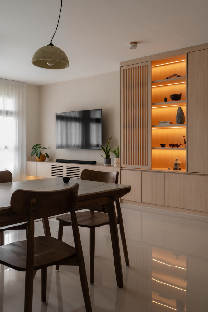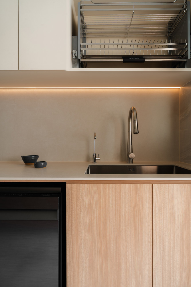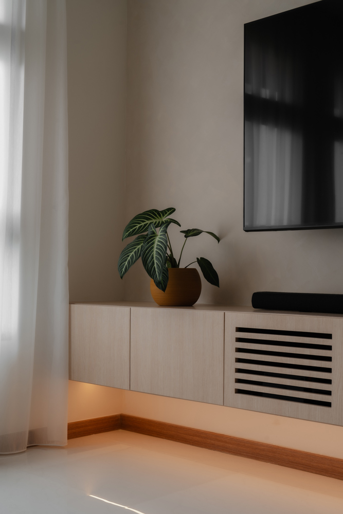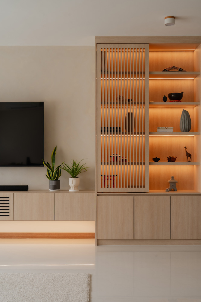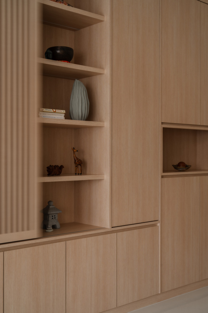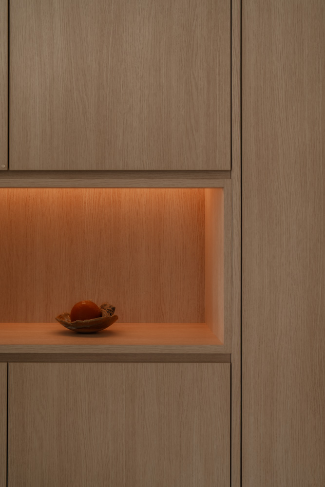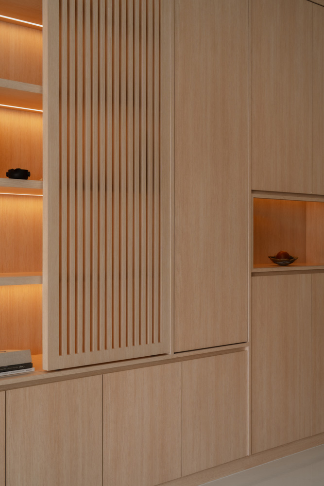 Handle-less, floor-to-ceiling panels conceal everyday clutter, while hidden utilities maintain an uninterrupted flow. Within this minimal shell, curated niches with soft LED lighting create subtle focal points, adding warmth without disrupting the calm.