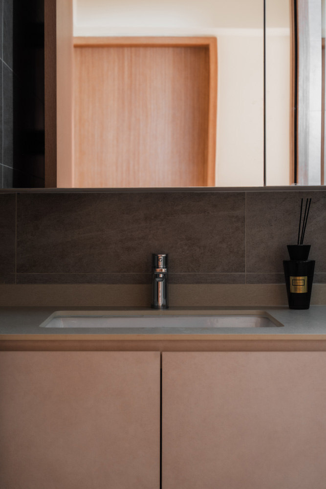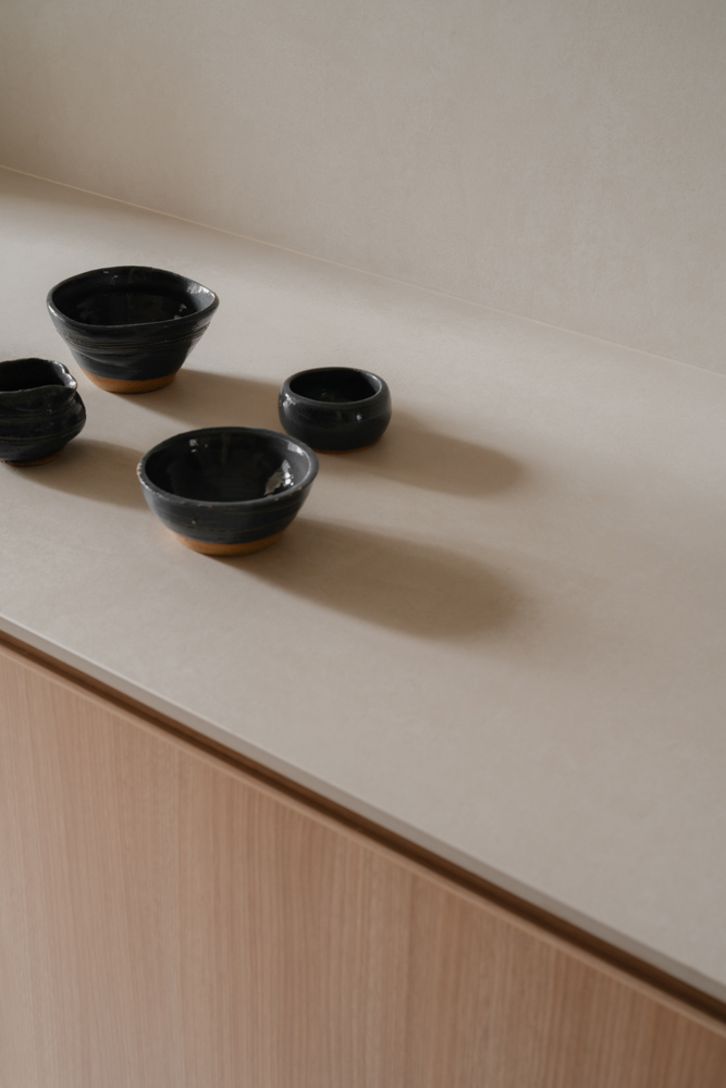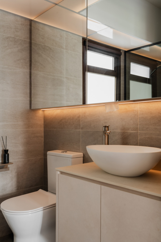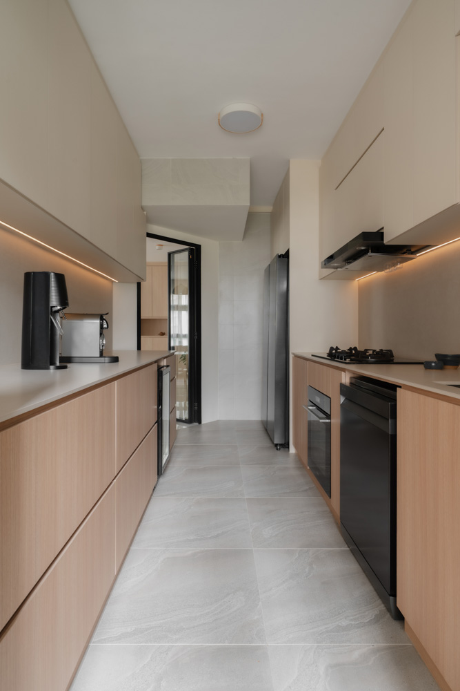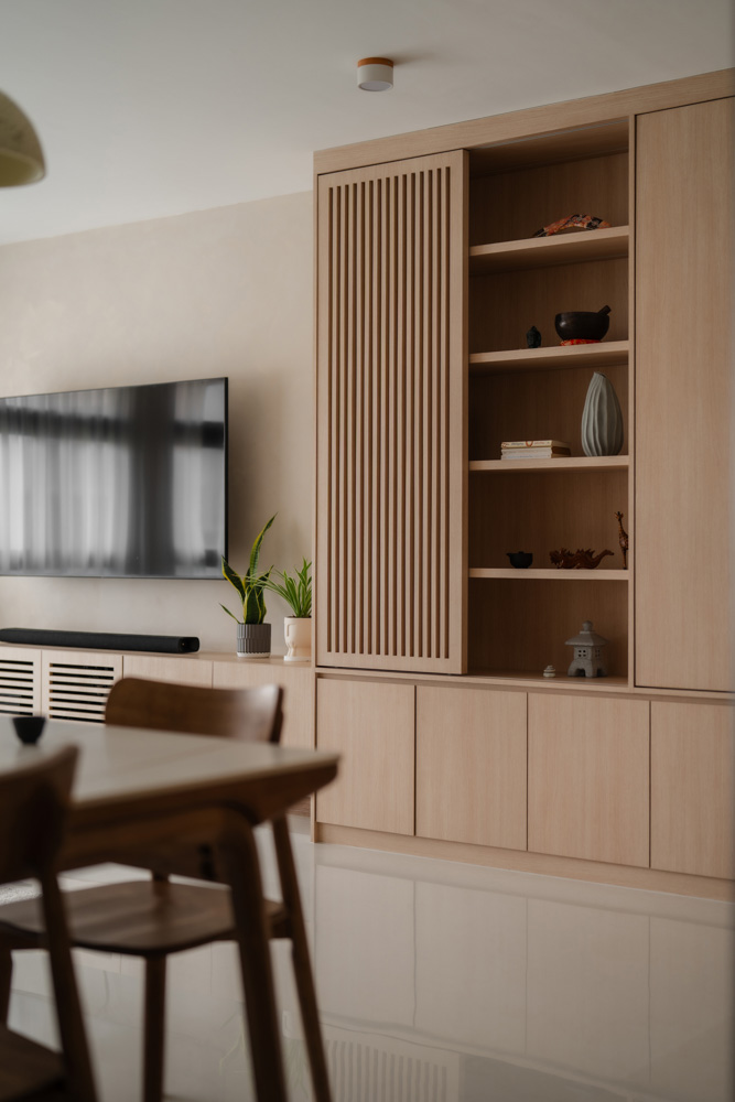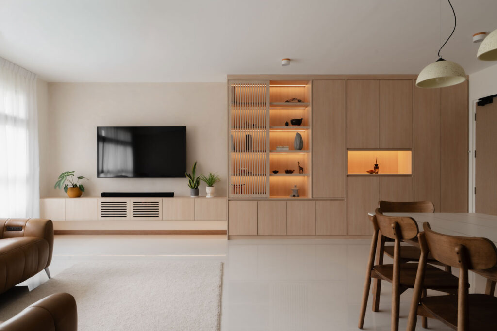 Handle-less, floor-to-ceiling panels conceal everyday clutter, while hidden utilities maintain an uninterrupted flow. Within this minimal shell, curated niches with soft LED lighting create subtle focal points, adding warmth without disrupting the calm.